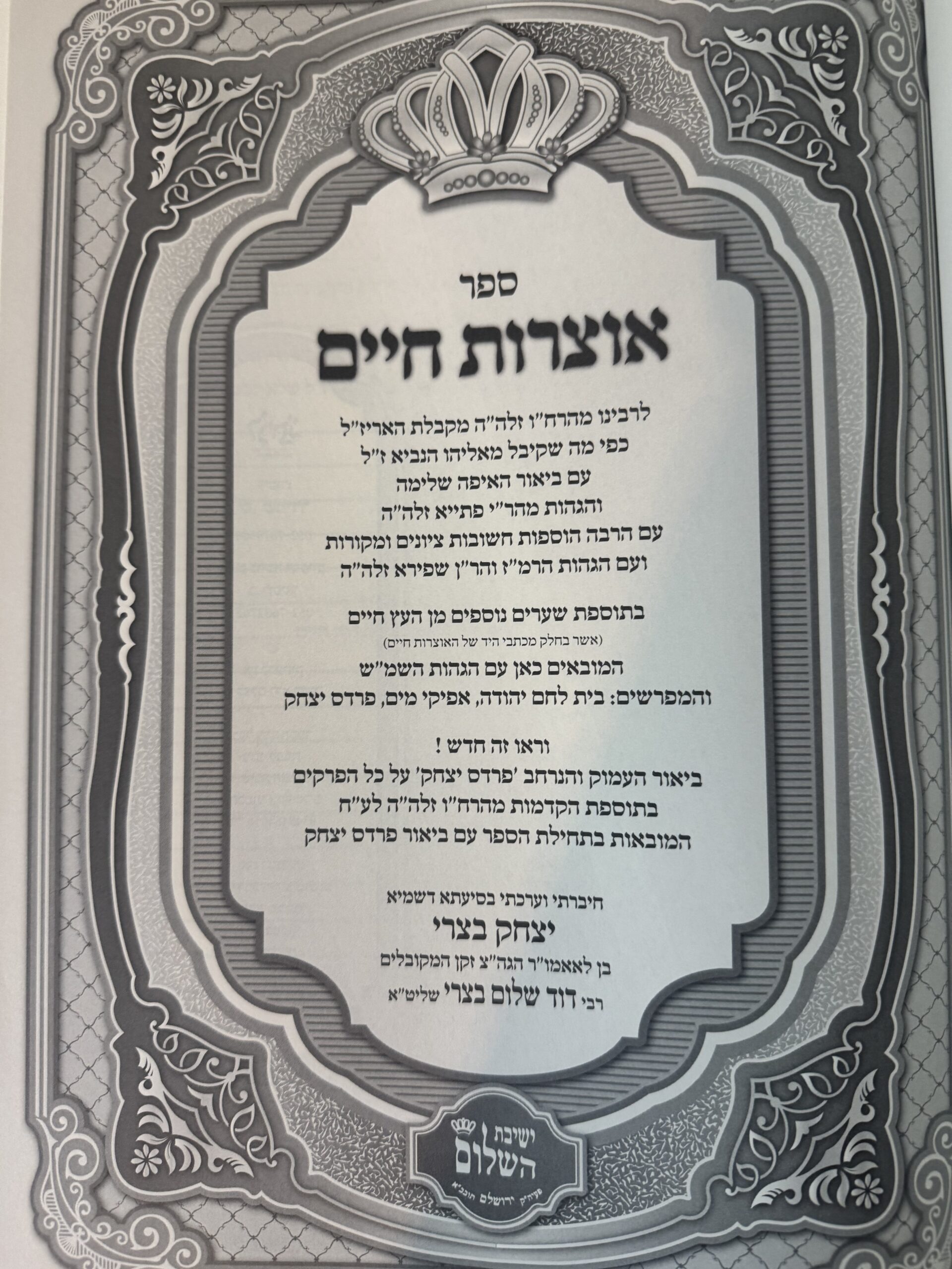 ספר אוצרות חיים עם איפה שלימה וביאור פרדס יצחק והרבה הוספות